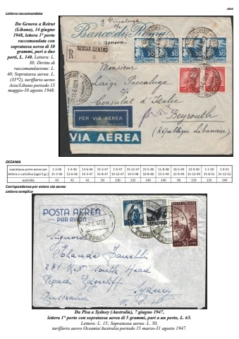 ASIA Lettera raccomandata Da Genova a Beirut (Libano), 14 giugno 1948, lettera 1%u00b0 porto raccomandata con sopratassa aerea di 10 grammi, pari a due porti, L. 140. Lettera: L. 30; Diritto di raccomandazione: L. 40; Sopratassa aerea: L. (35*2), tariffario aereo Asia/Libano periodo 15 maggio-10 agosto 1948. OCEANIA Corrispondenza per estero via aerea Lettera semplice Da Pisa a Sydney (Australia), 7 giugno 1947, lettera 1%u00b0 porto con sopratassa aerea di 5 grammi, pari a un porto, L. 65. Lettera: L. 15; Sopratassa aerea: L. 50, tariffario aereo Oceania/Australia periodo 15 marzo-31 agosto 1947.
