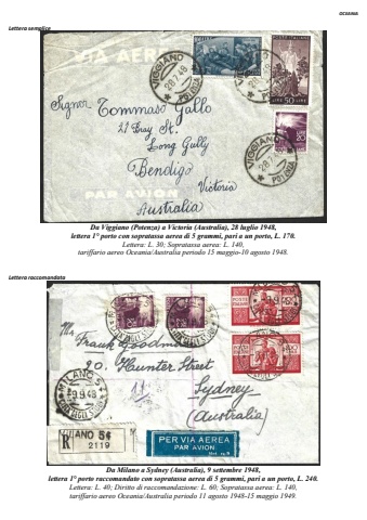 OCEANIA Lettera semplice Da Viggiano (Potenza) a Victoria (Australia), 28 luglio 1948, lettera 1%u00b0 porto con sopratassa aerea di 5 grammi, pari a un porto, L. 170. Lettera: L. 30; Sopratassa aerea: L. 140, tariffario aereo Oceania/Australia periodo 15 maggio-10 agosto 1948. Lettera raccomandata Da Milano a Sydney (Australia), 9 settembre 1948, lettera 1%u00b0 porto raccomandato con sopratassa aerea di 5 grammi, pari a un porto, L. 240. Lettera: L. 40; Diritto di raccomandazione: L. 60; Sopratassa aerea: L. 140, tariffario aereo Oceania/Australia periodo 11 agosto 1948-15 maggio 1949.