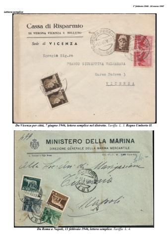 1%u00b0 febbraio 1946 - 24 marzo 1947 Lettera semplice Da Vicenza per citt%u00e0, 7 giugno 1946, lettera semplice nel distretto. Tariffa: L. 3. Regno Umberto II. Da Roma a Napoli, 13 febbraio 1946, lettera semplice. Tariffa: L. 4.