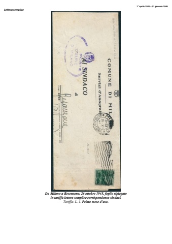 1%u00b0 aprile 1945 %u2013 31 gennaio 1946 Lettera semplice Da Milano a Besenzone, 26 ottobre 1945, foglio ripiegatoin tariffa lettera semplice corrispondenza sindaci. Tariffa: L. 1. Primo mese d%u2019uso.