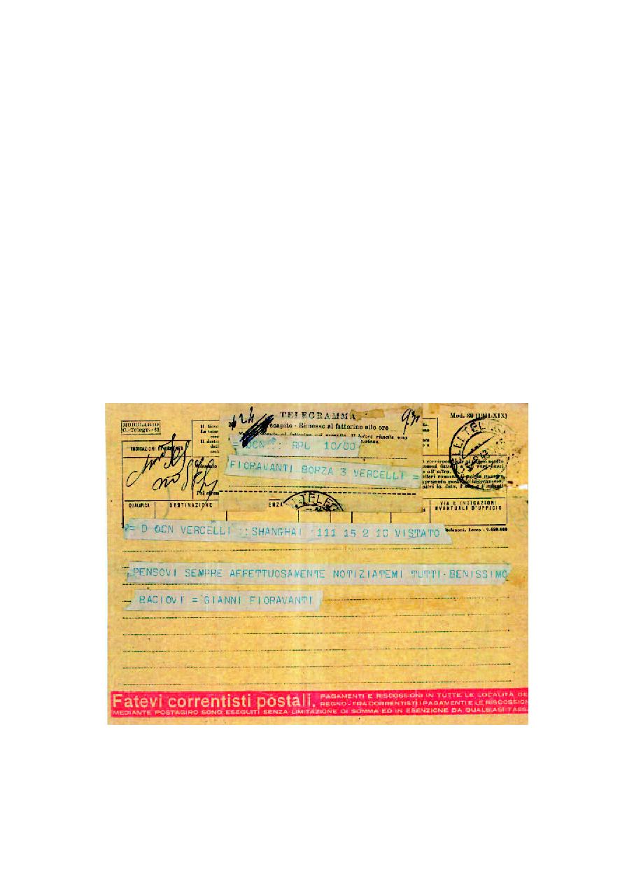 Fig. 45 - Telegramma di un marinaio della “Lepanto” spedito da Shanghai a Vercelli; giunto in data 3.8.1943.